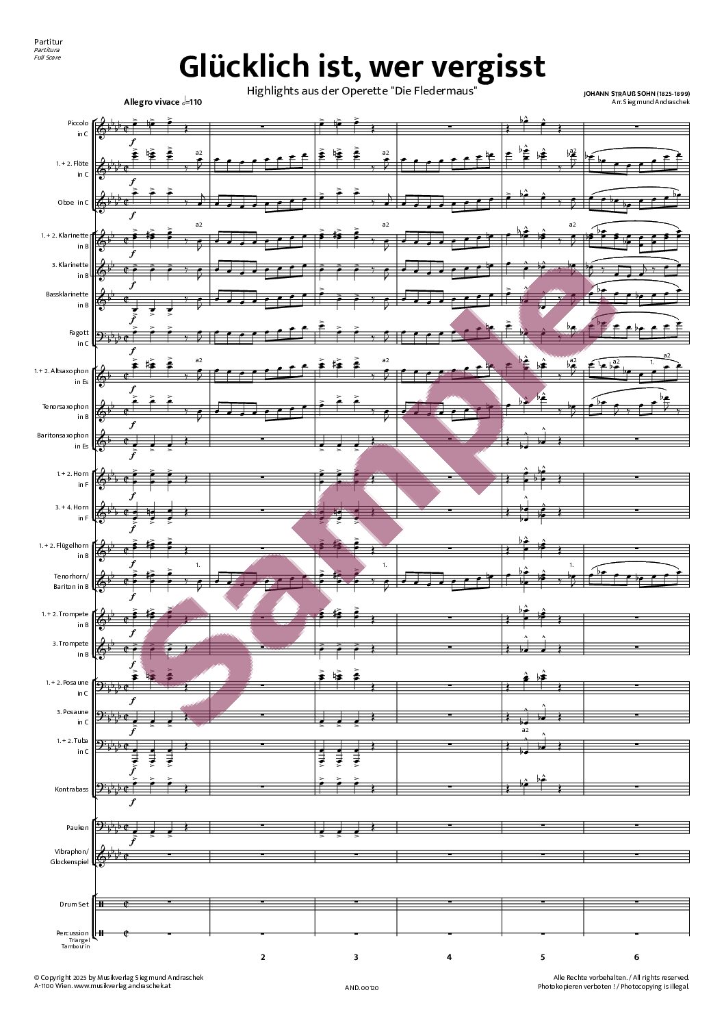 Der Ablauf der Ausschnitte ist wie folgt: Beginnend mit den unverwechselbaren Anfangstakten aus der Ouvertüre zur Operette, springt das Arrangement in das Walzerthema (ebenfalls aus der Ouvertüre) und mündet im Duett aus dem ersten Akt (Rosalinde/Alfred) „Trinke Liebchen, trinke schnell (…)“, im Text heißt es später „Glücklich ist, wer vergisst, was nicht zu ändern ist“. Die Bearbeitung springt zum berühmten Couplet (Orlovsky) aus dem zweiten Akt „Ich lade gern mir Gäste ein“, aus dem dritten Akt folgt das Couplet (Adele) „Spiel ich die Unschuld vom Lande“. Abschließend folgt das Finale aus dem zweiten Akt „Im Feuerstrom der Reben“. Die „Fledermaus“ ist voll von unglaublich eingängigen und schönen Melodien, aufgrund vieler schwieriger Passagen und auch der Spiellänge (zB. Der kompletten Ouvertüre) finden sich Ausschnitte aus dieser Operette seltener im Repertoire der Blasorchester. Dieses Arrangement lädt nun dazu ein, sich dennoch und unbedingt für eine kurze Zeit den schönen Melodien der „Fledermaus“ zu widmen. Es soll Appetit auf einen Abend in einem Opernhaus machen, die diese Operette in ihrem Repertoire hat (zB. Wiener Volksoper). Dem Konzertpublikum wird es in jedem Fall gefallen, schließlich handelt es sich hier um eine der erfolgreichsten Bühnenwerke der Musikgeschichte. Viel Vergnügen mit „Glücklich ist, wer vergisst“.